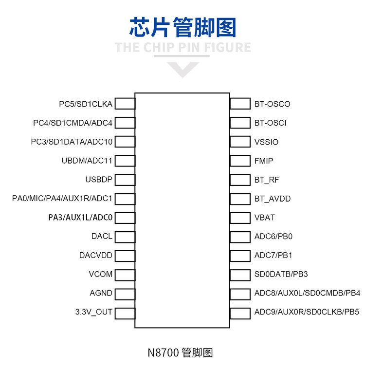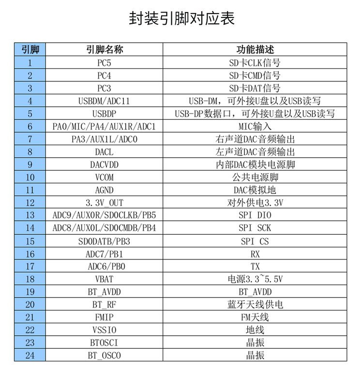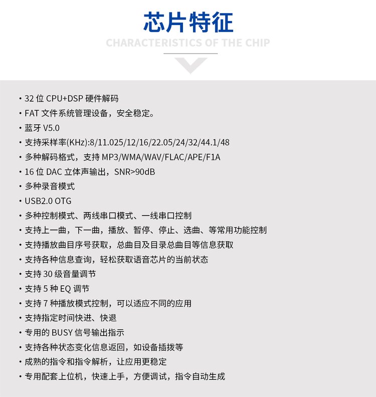 产品特征:★32位CPU+DSP 硬件解码;★蓝牙V5.0,USB2.0 OTG;★16位DAC立体声输出,SNR>90dB;★专用的 BUSY 信号输出指示;★支持 30 级音量调节,5种EQ调节;★支持播放曲目序号获取,总曲目及目录总曲目等信息获取;
