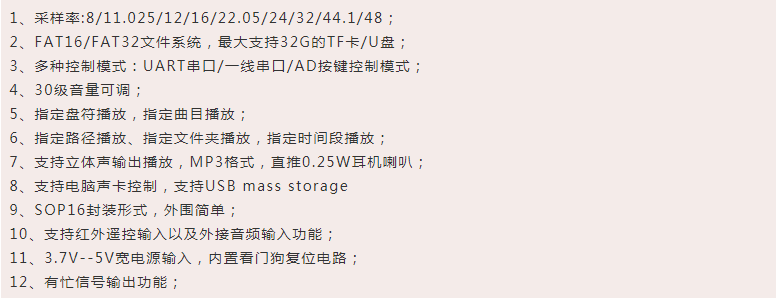 N930X是一个提供串口的MP3 芯片,完美的集成了MP3、WMV 的硬解码芯片。它包括了四种功能型号的MP3芯片,即N9300、N9301、N9302和N9303 MP3芯片,支持TF 卡驱动,支持电脑直接更新spi flash 的内容,支持FAT16、FAT32 文件系统。通过简单的UART串口指令或一线串口指令即可完成播放指定的音乐,以及如何播放音乐等功能,无需繁琐的底层操作,音质优美,使用方便,稳定可靠是此款产品的最大特点。另外该芯片也是深度定制的产品,专为自定义语音播放领域开发的低成本解决方案,可以根据不同的功能需要选择对应的型号,是一款精简版的也是性价比非常高的MP3芯片。9300可无缝替换9100芯片,详情可在线咨询客服。